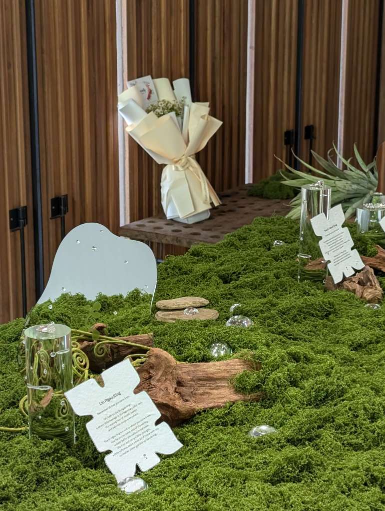 The launch was held at Papan Haus, an independent arts space in PJ. It is named for the eight foldable wood walls that open to terrazzo flooring, leading to a generous floor-to-ceiling glass wall that frames the gentle sway of a willow tree, and birdhouse air vents that line the wall of the staircase. In the centre of the space was a long table, laid with a soft bed of moss and decorated with fragments of wood and stone. Delicate dewdrops rested on the moss. Clear water pooled as mirrors or bubbled with jewelry, as though rising from an underground spring. A meditative description printed on seed paper accompanied each piece.